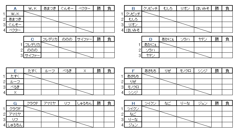 僕のコミュの掲示板の方に「○リーグ ××対▼▼ ××の勝ち」という形で勝者が書き込んで下さい